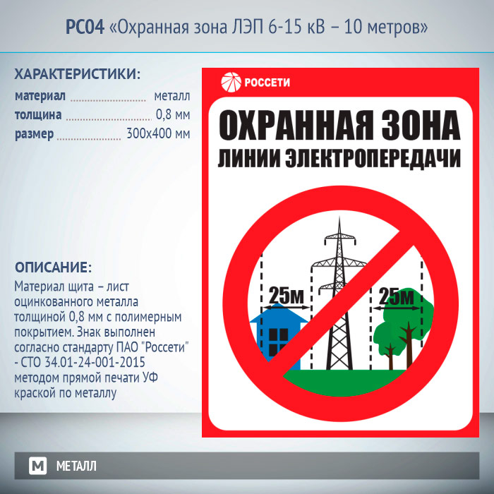 Знак «Охранная зона ЛЭП 6-15 кВ – 10 метров», РС04 (металл, 300х400 мм) в Москве купить