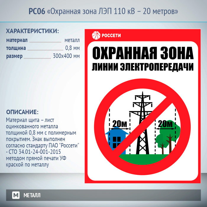Знак «Охранная зона ЛЭП 110 кВ – 20 метров», РС06 (металл, 300х400 мм) в Москве купить