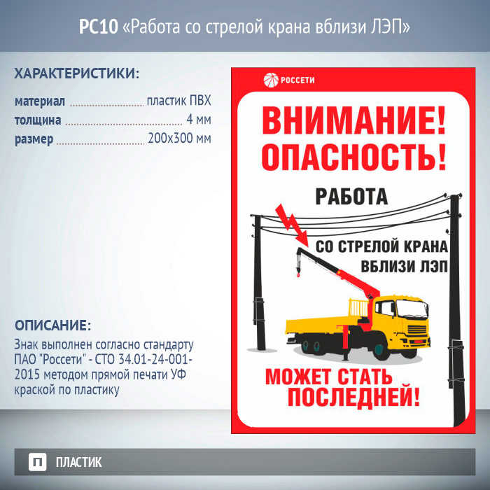 Знак «Работа со стрелой крана вблизи ЛЭП», РС10 (пластик 2 мм, 200х300 мм) в Москве купить