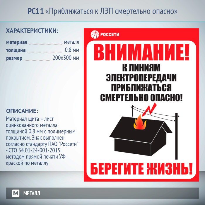 Знак «Приближаться к ЛЭП смертельно опасно», РС11 (металл, 200х300 мм) в Москве купить