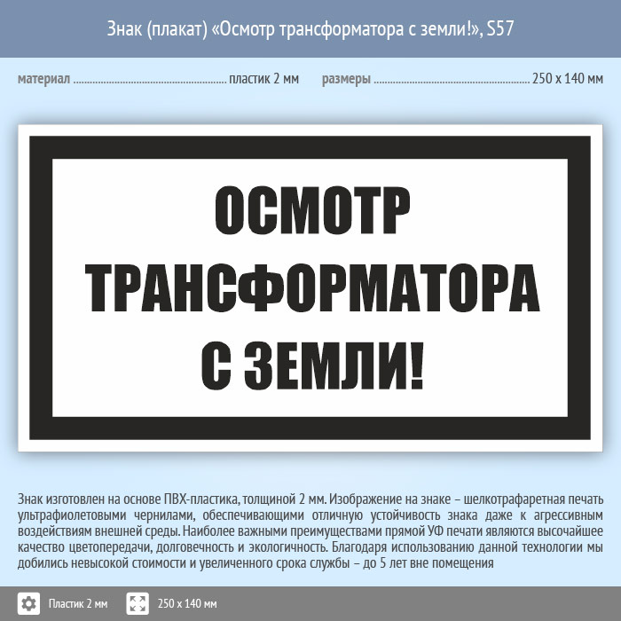 Знак (плакат) «Осмотр трансформатора с земли!», S57 (пластик, 250х140 мм) в Москве купить