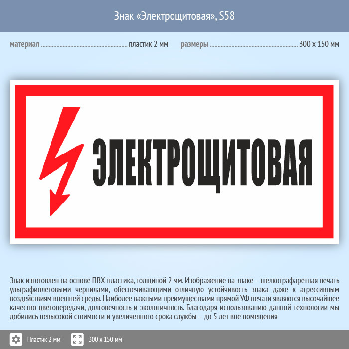 Знак (плакат) «Электрощитовая», S58 (пластик, 300х150 мм) в Москве купить