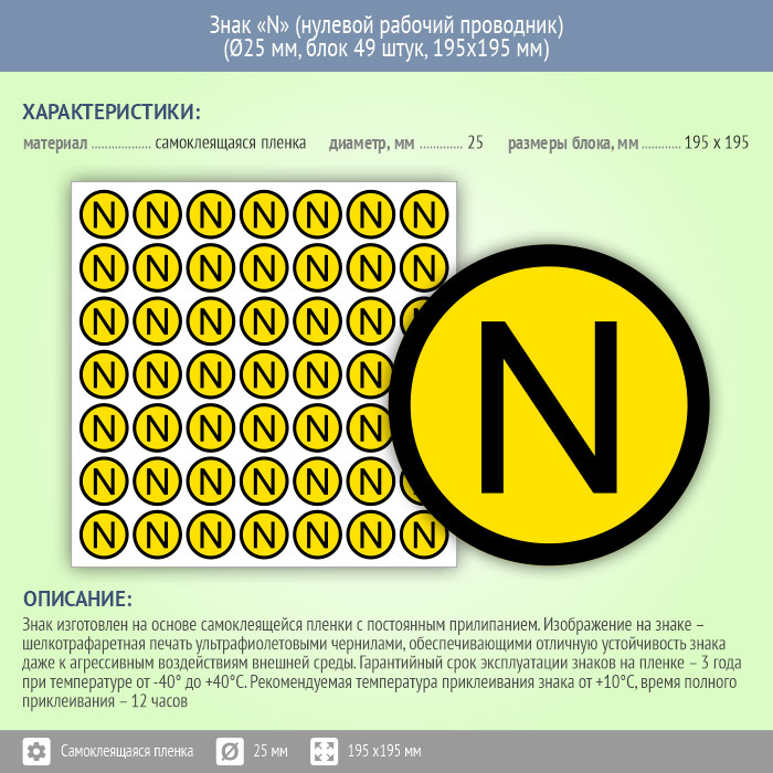 Знак (плакат) «N» (нулевой рабочий проводник), S47 (пленка, диаметр 25 мм, блок 49 штук, 195х195 мм) в Москве купить
