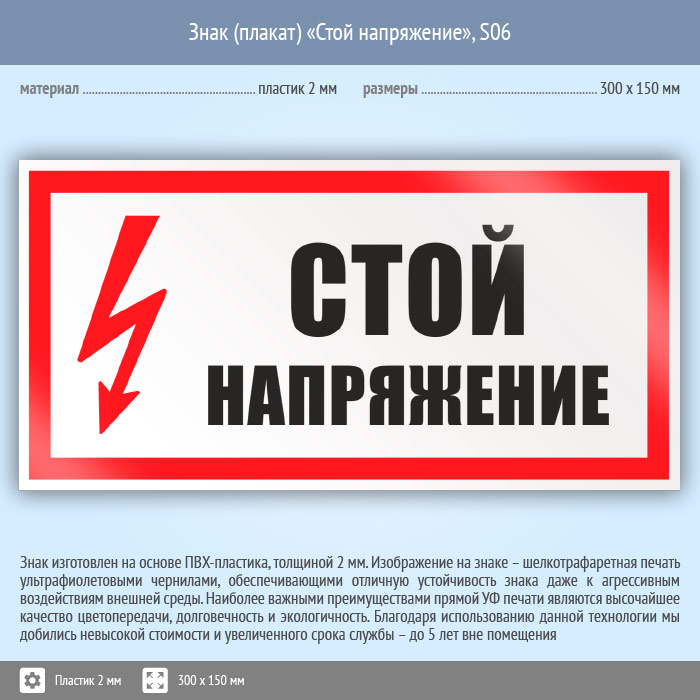 Знак (плакат) «Стой напряжение», S06 (пластик, 300х150 мм) в Москве купить