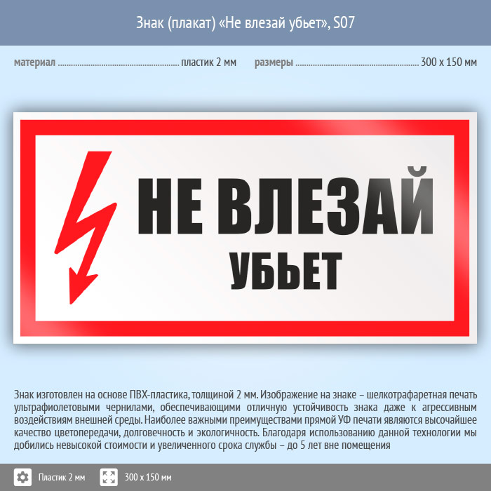 Знак (плакат) «Не влезай убьет», S07 (пластик, 300х150 мм) в Москве купить