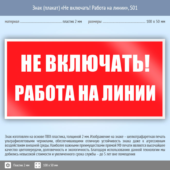 Знак (плакат) «Не включать! Работа на линии», S01 (пластик, 100х50 мм) в Москве купить