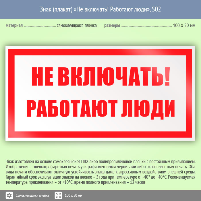 Знак (плакат) «Не включать! Работают люди», S02 (пленка, 100х50 мм) в Москве купить