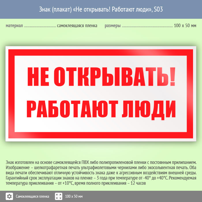 Знак (плакат) «Не открывать! Работают люди», S03 (пленка, 100х50 мм) в Москве купить