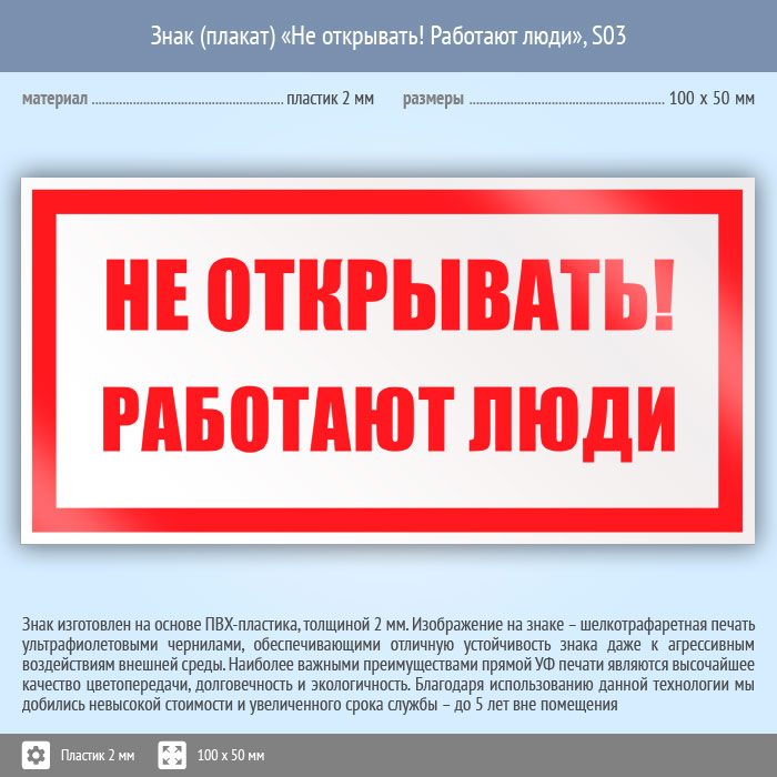 Знак (плакат) «Не открывать! Работают люди», S03 (пластик, 100х50 мм) в Москве купить