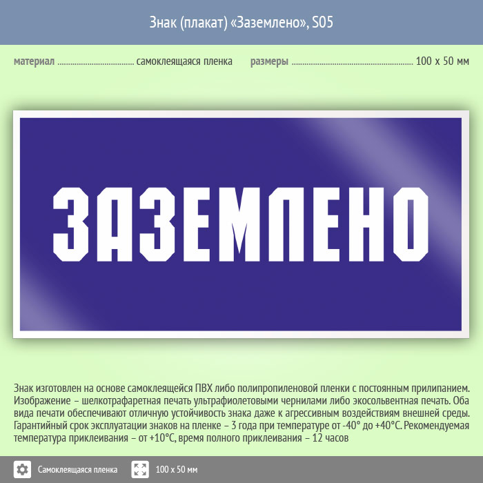 Знак (плакат) «Заземлено», S05 (пленка, 100х50 мм) в Москве купить