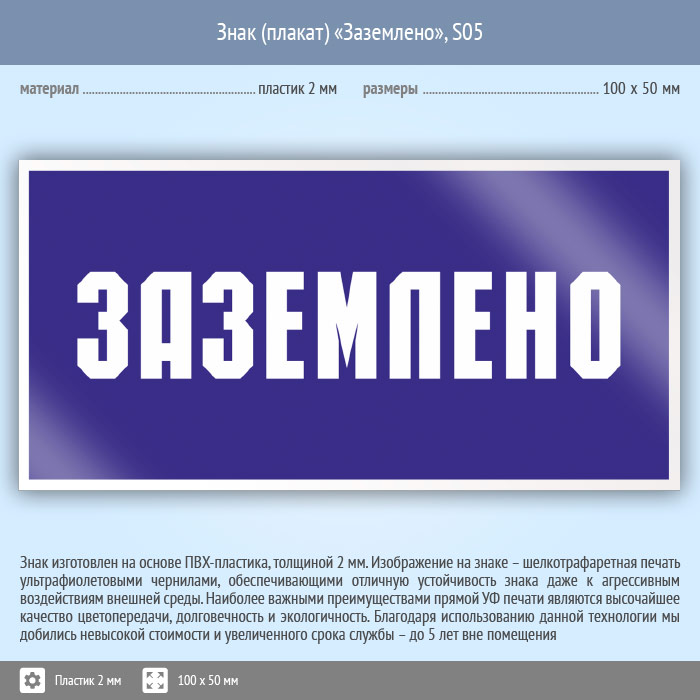 Знак (плакат) «Заземлено», S05 (пластик, 100х50 мм) в Москве купить