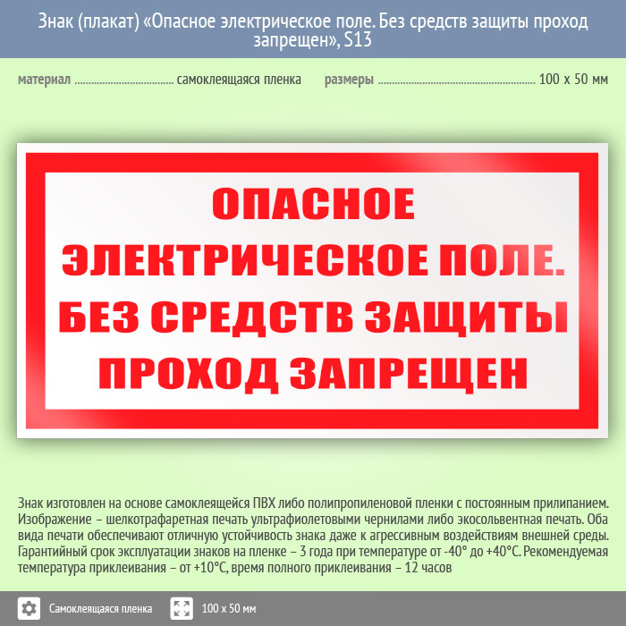 Знак (плакат) «Опасное электрическое поле. Без средств защиты проход запрещен», S13 (пленка, 100х50 мм) в Москве купить