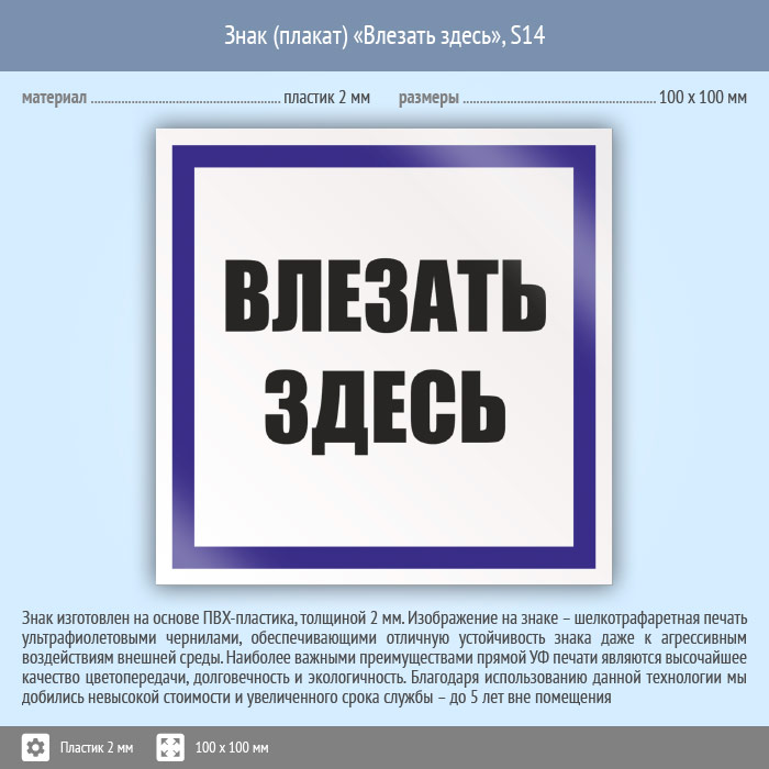 Знак (плакат) «Влезать здесь», S14 (пластик, 100х100 мм) в Москве купить
