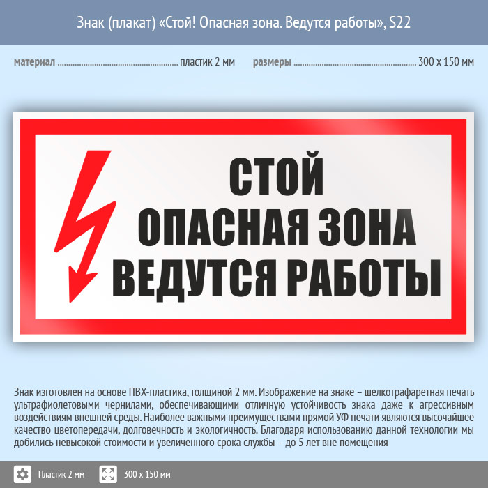 Знак (плакат) «Стой! Опасная зона. Ведутся работы», S22 (пластик, 300х150 мм) в Москве купить