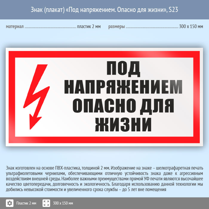 Знак (плакат) «Под напряжением. Опасно для жизни», S23 (пластик, 300х150 мм) в Москве купить