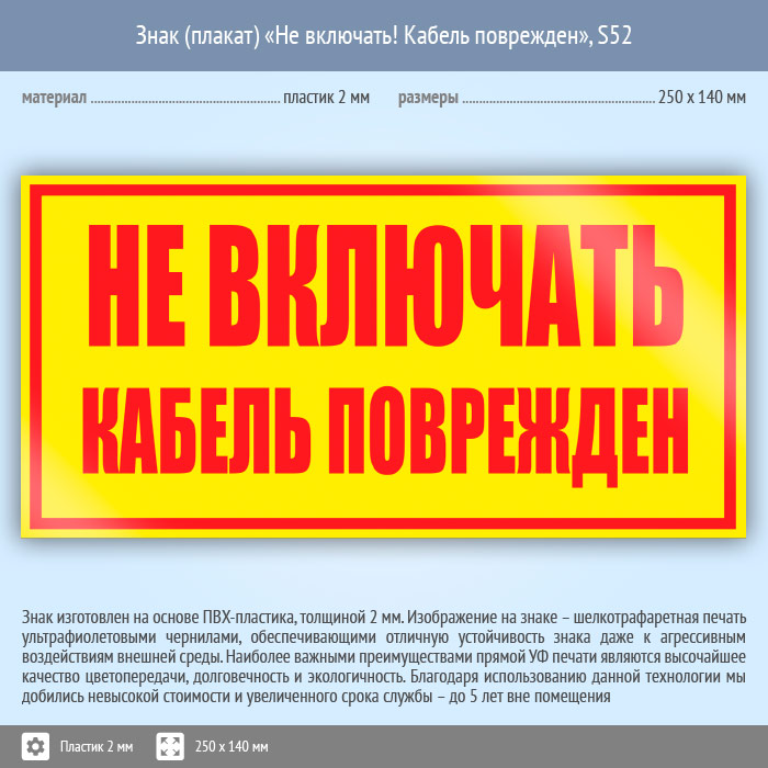 Знак (плакат) «Не включать! Кабель поврежден», S52 (пластик, 250х140 мм) в Москве купить