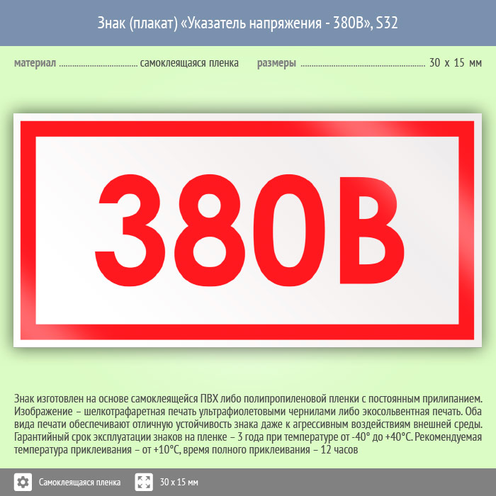 Знак (плакат) «Указатель напряжения - 380В», S32 (50 штук, пленка, 30х15 мм) в Москве купить