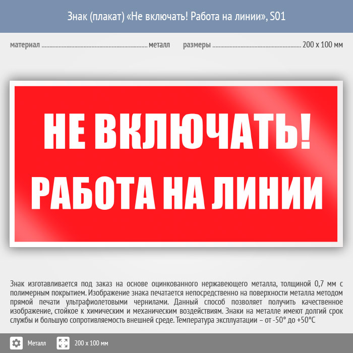 Знак (плакат) «Не включать! Работа на линии», S01 (металл, 200х100 мм) в Москве купить