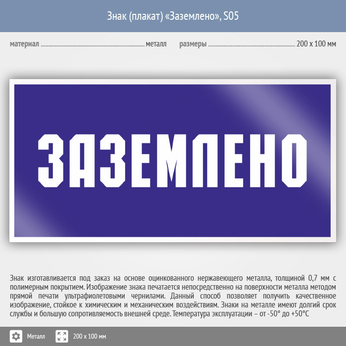 Знак (плакат) «Заземлено», S05 (металл, 200х100 мм) в Москве купить