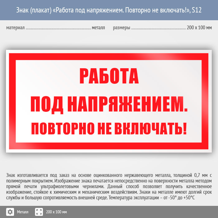 Знак (плакат) «Работа под напряжением. Повторно не включать!», S12 (металл, 200х100 мм) в Москве купить