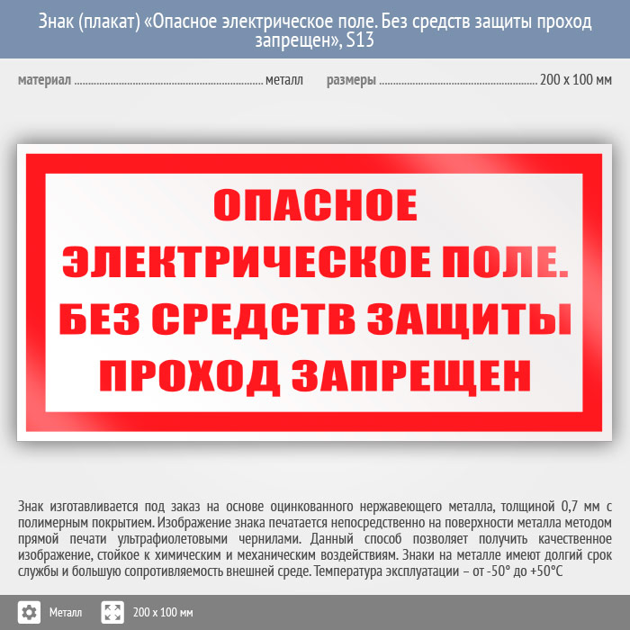 Знак (плакат) «Опасное электрическое поле. Без средств защиты проход запрещен», S13 (металл, 200х100 мм) в Москве купить