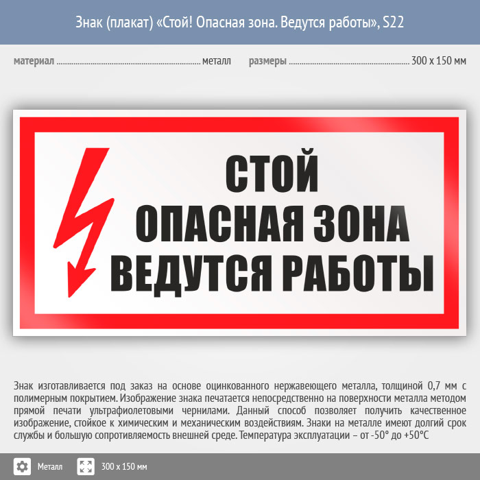Знак (плакат) «Стой! Опасная зона. Ведутся работы», S22 (металл, 300х150 мм) в Москве купить