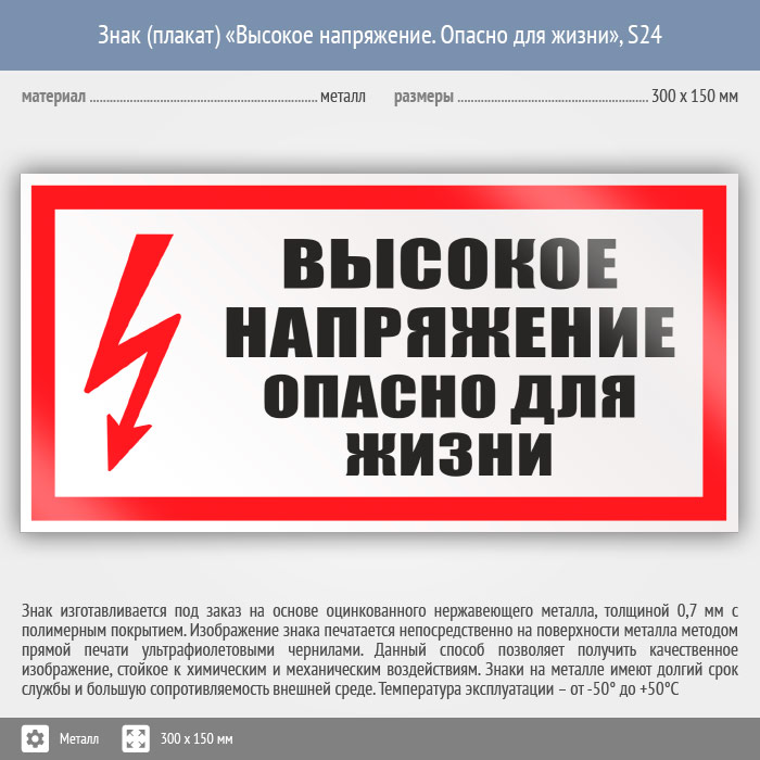 Знак (плакат) «Высокое напряжение. Опасно для жизни», S24 (металл, 300х150 мм) в Москве купить