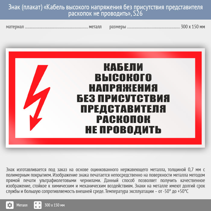 Знак (плакат) «Кабель высокого напряжения без присутствия представителя раскопок не проводить», S26 (металл, 300х150 мм) в Москве купить