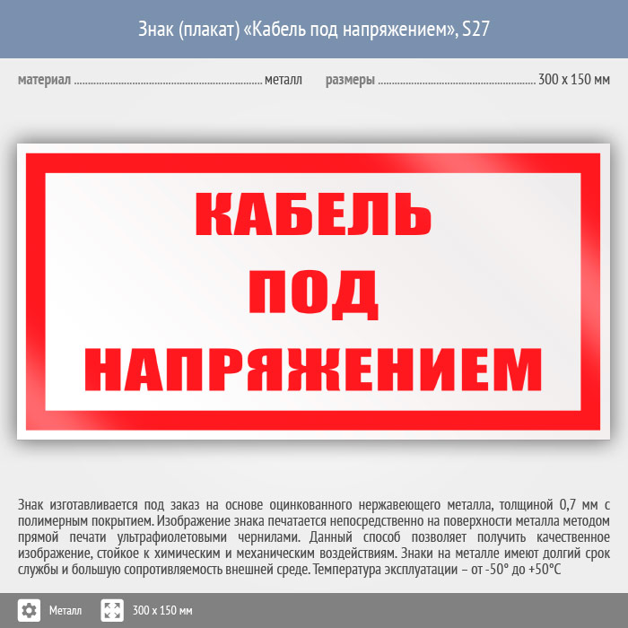 Знак (плакат) «Кабель под напряжением», S27 (металл, 300х150 мм) в Москве купить