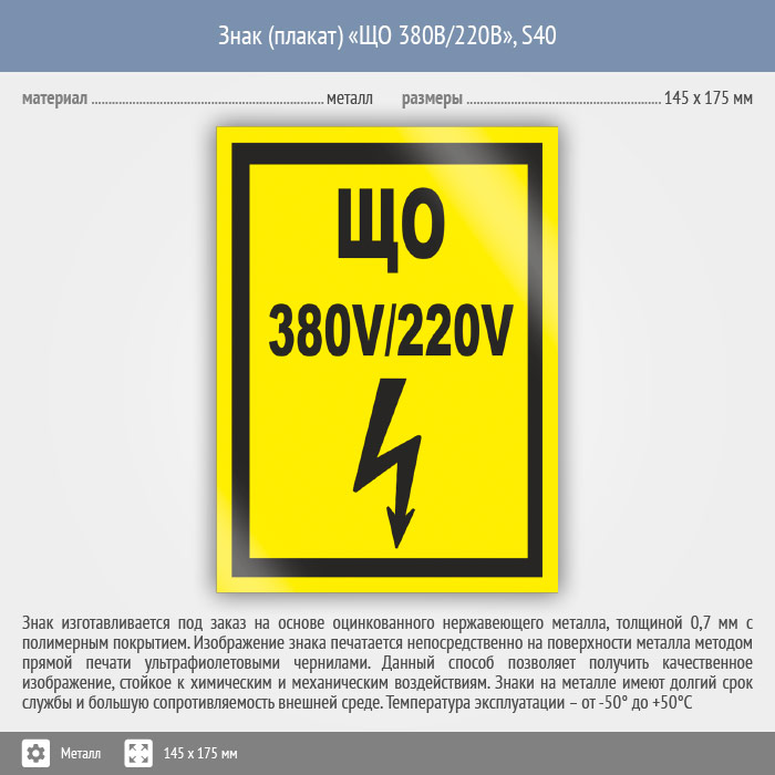 Знак (плакат) «ЩО 380В/220В», S40 (металл, 145х175 мм) в Москве купить