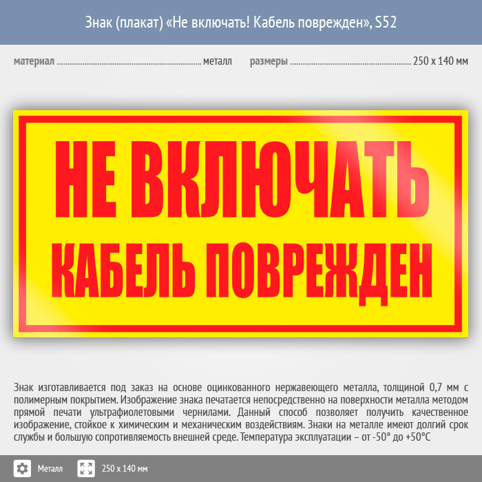 Знак (плакат) «Не включать! Кабель поврежден», S52 (металл, 250х140 мм) в Москве купить