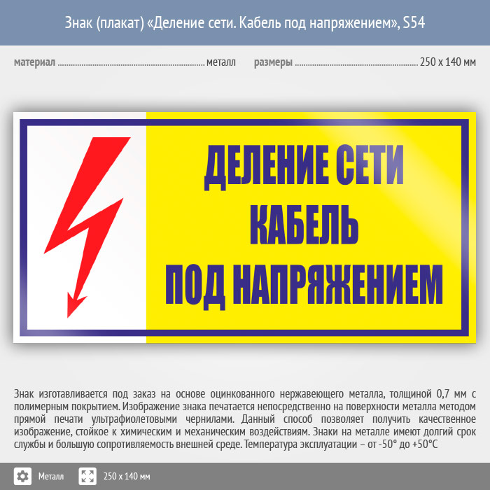 Знак (плакат) «Деление сети. Кабель под напряжением», S54 (металл, 250х140 мм) в Москве купить
