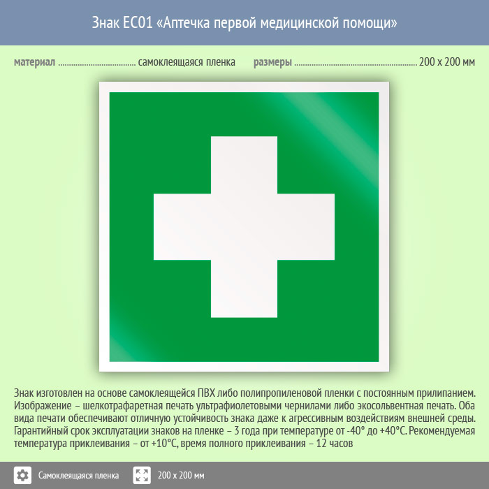 Знак EC01 «Аптечка первой медицинской помощи» (пленка, 200х200 мм) в Москве купить