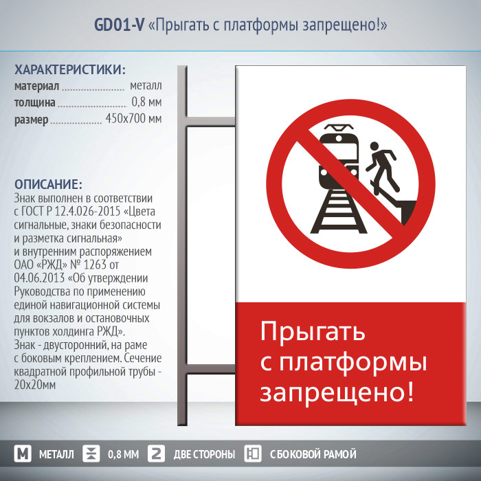 Знак «Прыгать с платформы запрещено!», GD01-V (двусторонний вертикальный, 450х700 мм, металл, на раме с боковым креплением) в Москве купить