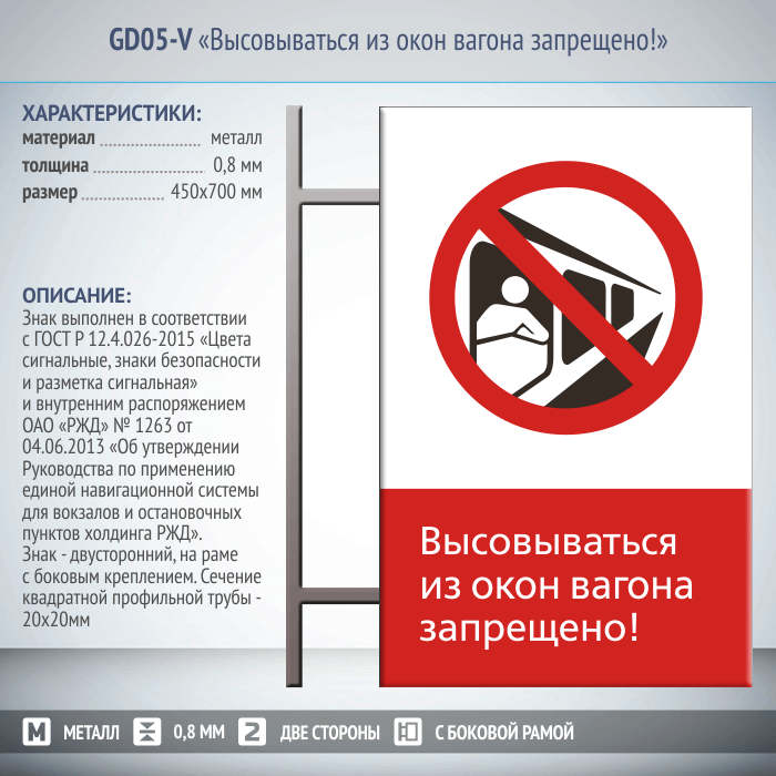 Знак «Высовываться из окон вагона запрещено!», GD05-V (двусторонний вертикальный, 450х700 мм, металл, на раме с боковым креплением) в Москве купить