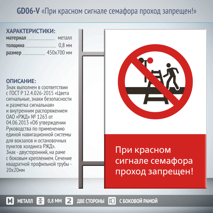 Знак «При красном сигнале семафора проход запрещен!», GD06-V (двусторонний вертикальный, 450х700 мм, металл, на раме с боковым креплением) в Москве купить