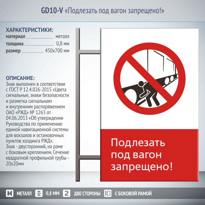 Знак «Подлезать под вагон запрещено!», GD10-V (двусторонний вертикальный, 450х700 мм, металл, на раме с боковым креплением) в Москве купить