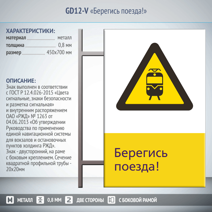 Знак «Берегись поезда!», GD12-V (двусторонний вертикальный, 450х700 мм, металл, на раме с боковым креплением) в Москве купить