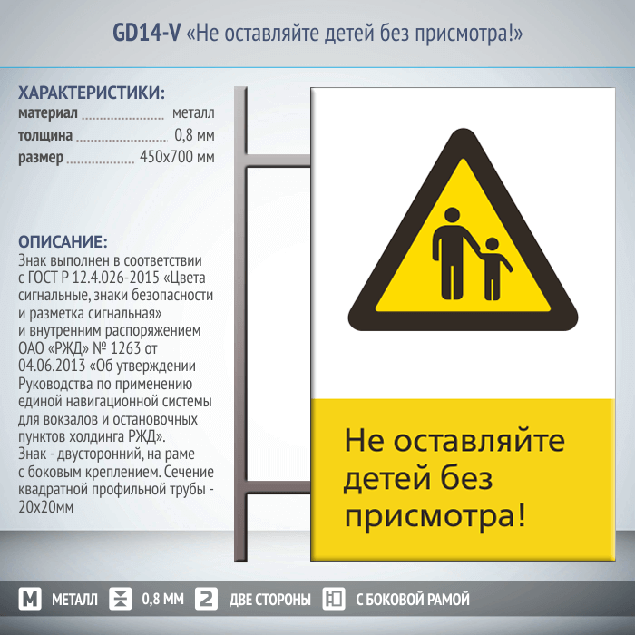 Знак «Не оставляйте детей без присмотра!», GD14-V (двусторонний вертикальный, 450х700 мм, металл, на раме с боковым креплением) в Москве купить