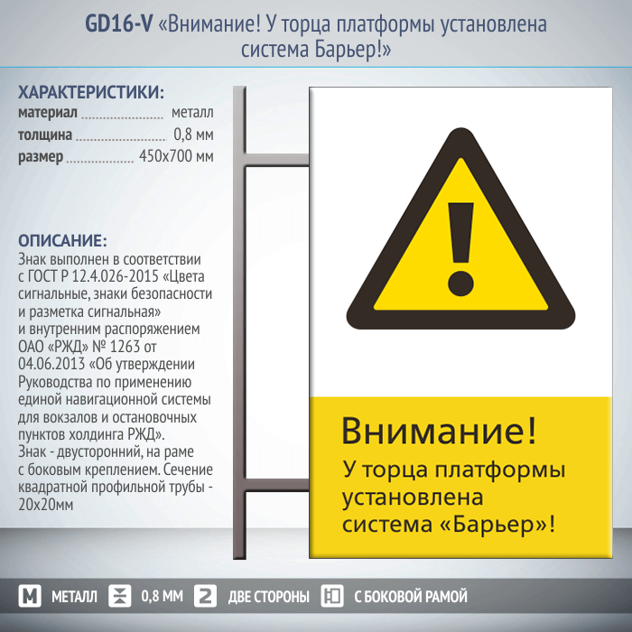 Знак «Внимание! У торца платформы установлена система Барьер!», GD16-V (двусторонний вертикальный, 450х700 мм, металл, на раме с боковым креплением) в Москве купить