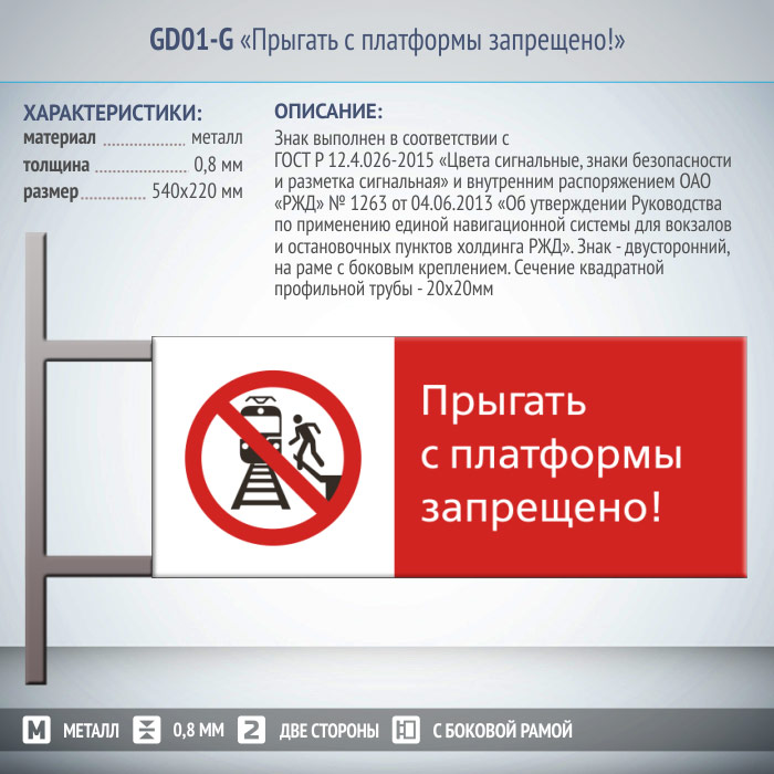Знак «Прыгать с платформы запрещено!», GD01-G (двусторонний горизонтальный, 540х220 мм, металл, на раме с боковым креплением) в Москве купить