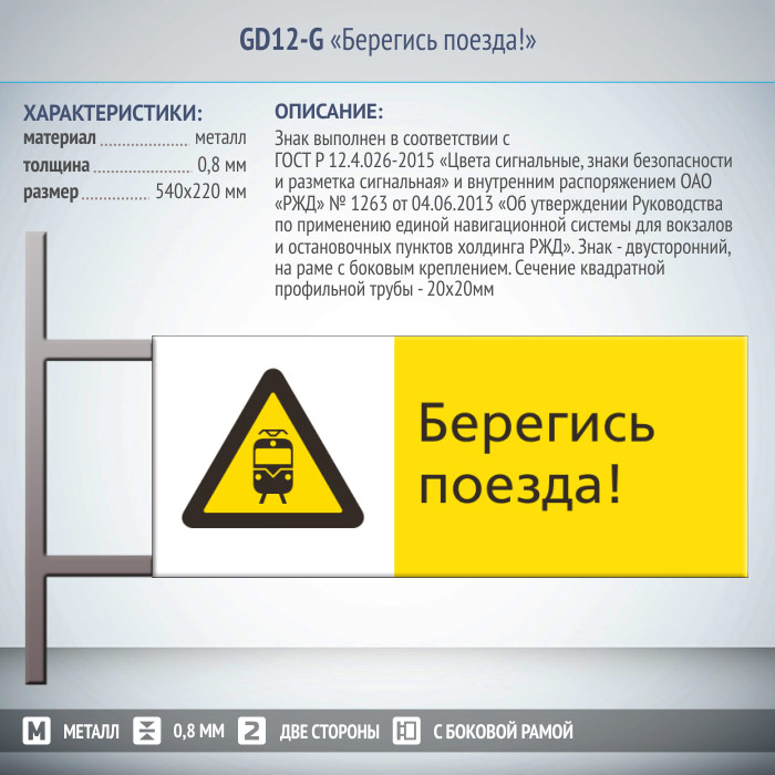 Знак «Берегись поезда!», GD12-G (двусторонний горизонтальный, 540х220 мм, металл, на раме с боковым креплением) в Москве купить