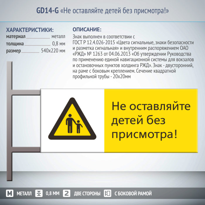 Знак «Не оставляйте детей без присмотра!», GD14-G (двусторонний горизонтальный, 540х220 мм, металл, на раме с боковым креплением) в Москве купить