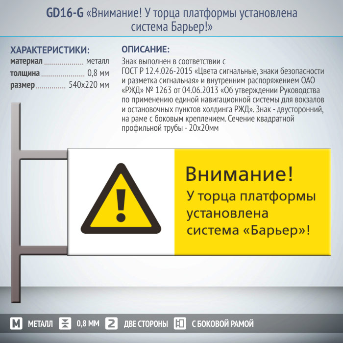 Знак «Внимание! У торца платформы установлена система Барьер!», GD16-G (двусторонний горизонтальный, 540х220 мм, металл, на раме с боковым креплением) в Москве купить