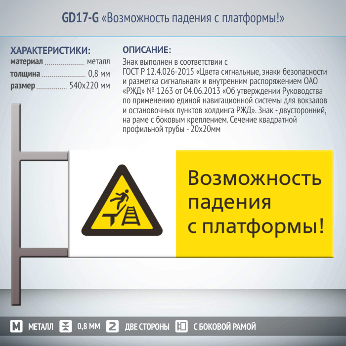 Знак «Возможность падения с платформы!», GD17-G (двусторонний горизонтальный, 540х220 мм, металл, на раме с боковым креплением) в Москве купить
