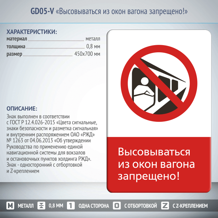 Знак «Высовываться из окон вагона запрещено!», GD05-V (односторонний вертикальный, 450х700 мм, металл, с отбортовкой и Z-креплением) в Москве купить