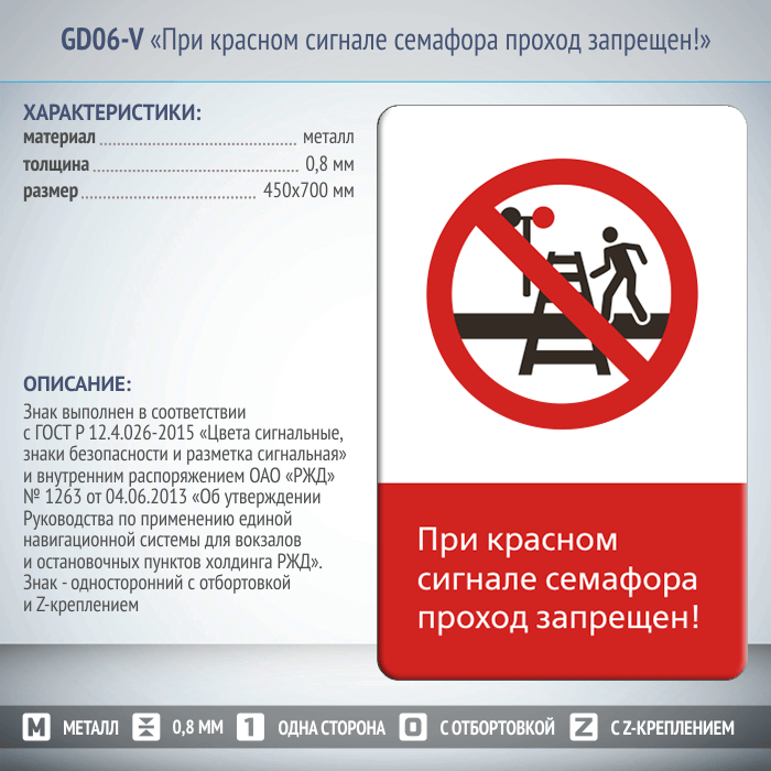 Знак «При красном сигнале семафора проход запрещен!», GD06-V (односторонний вертикальный, 450х700 мм, металл, с отбортовкой и Z-креплением) в Москве купить