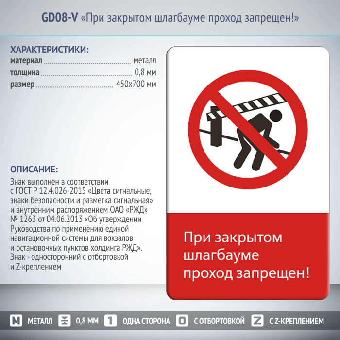 Знак «При закрытом шлагбауме проход запрещен!», GD08-V (односторонний вертикальный, 450х700 мм, металл, с отбортовкой и Z-креплением) в Москве купить