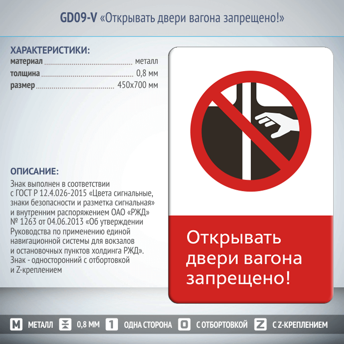 Знак «Открывать двери вагона запрещено!», GD09-V (односторонний вертикальный, 450х700 мм, металл, с отбортовкой и Z-креплением) в Москве купить