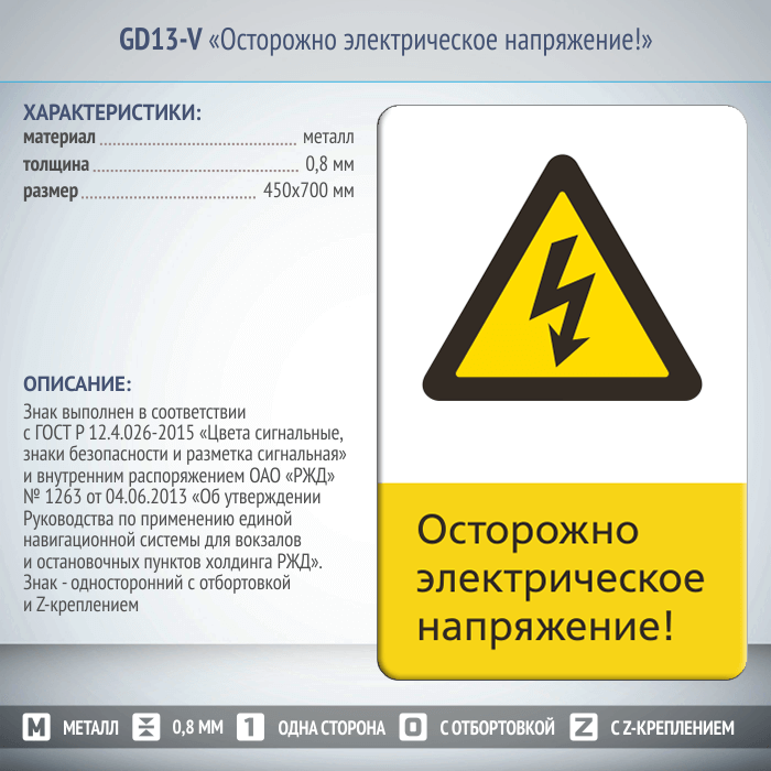 Знак «Осторожно электрическое напряжение!», GD13-V (односторонний вертикальный, 450х700 мм, металл, с отбортовкой и Z-креплением) в Москве купить